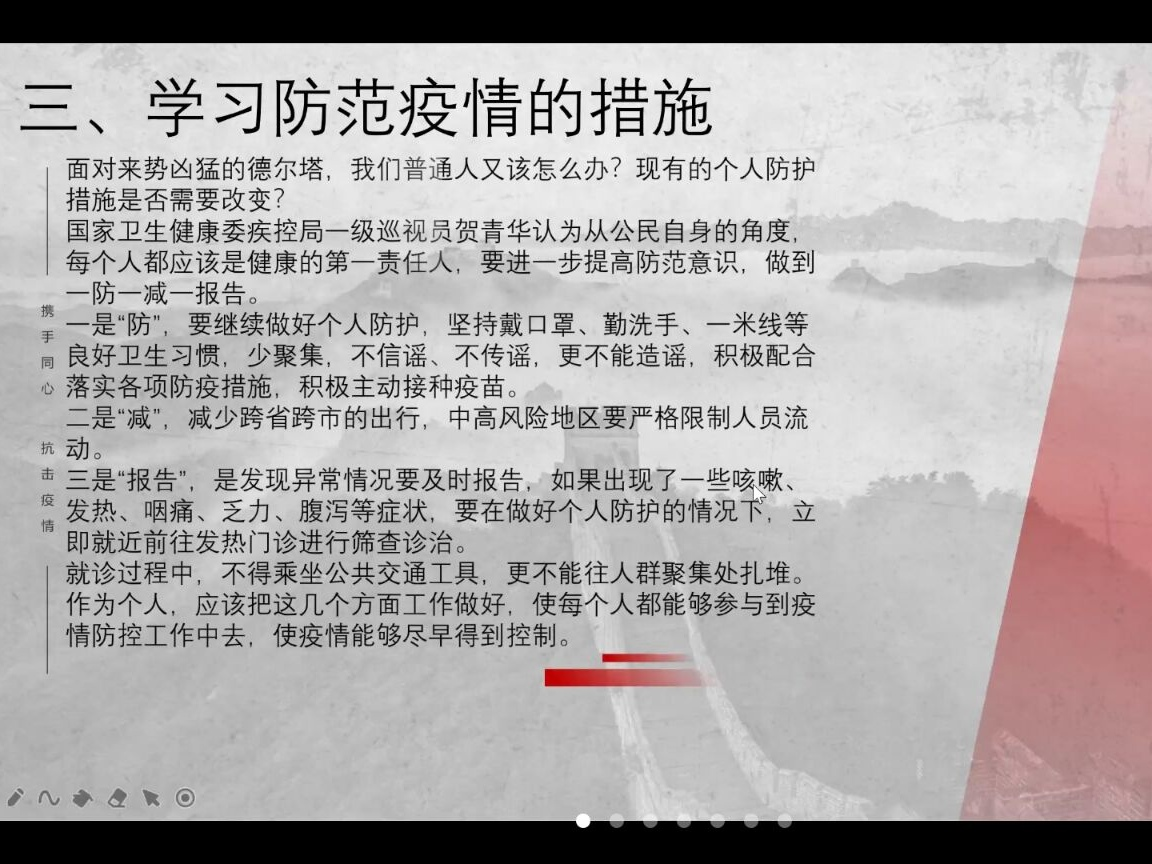 本次疫情防控线上主题团日活动的开展,使与会学生深入了解到疫情阻狙战的相关情况,提高了学生疫情防控意识,增强了同学们的责任感。作为健康的第一责任人,学生们应该主动学习防疫疫情防控知识,落实疫情防控的措施。一代人有一代人的使命,相信大家都能坚定信念,戮力同心,打赢这场没有硝烟的战争。