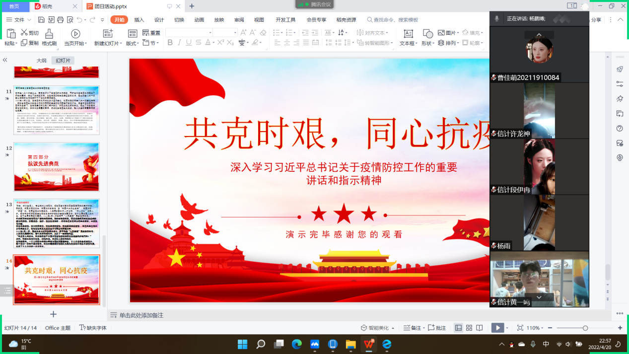 依照疫情防控要求,数统学院四月主题团日活动以线上会议的形式开展。统计学专业2021级团支部支书,向同学们展示了当前国内疫情最新数据消息,简单介绍了当前国内防疫形式,希望同学们都能了解学校疫情防控相关文件,加强自身防护意识。会议结束后,学生们对我国新冠肺炎疫情防控的近况有所了解,掌握了新冠肺炎疫情防控的相关知识。