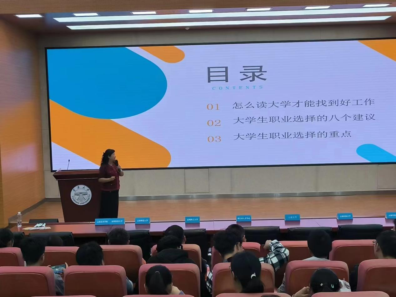 为更好地帮助学生正确认识自我,明确自我发展方向,树立初步的自我人生规划意识,提高规划未来的能力。2023年10月20日下午,我院于呈贡校区图书馆西附楼报告厅开展了大学生职业生涯规划教育讲座。本次讲座由辅导员王蔓琦主持,邀请了校外职业指导师杨煦怡主讲,全体2023级本科生参与。