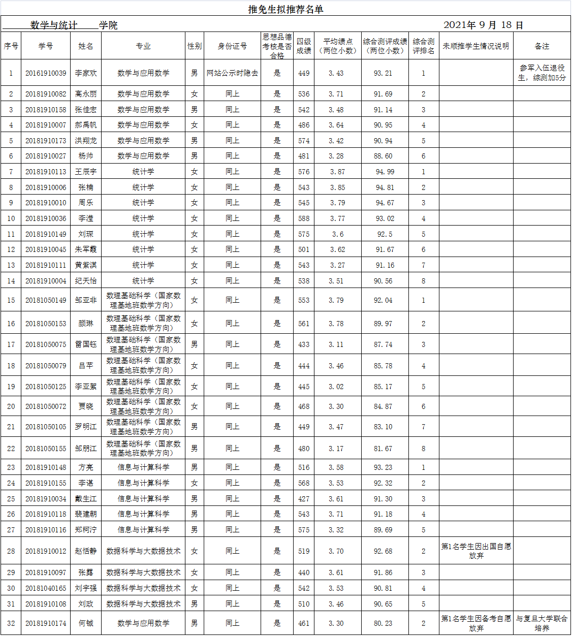 根据教育部相关文件精神,我院按照《云南大学2022年推荐优秀应届本科毕业生免试攻读研究生工作管理办法》要求,在学生本人申请、民主推荐、公开评选的基础上,学院推免生遴选工作小组本着公开、公平、公正的原则,严格按推荐条件择优确定初选名单,现将我院2022年免试攻读研究生拟推荐名单公示如下。