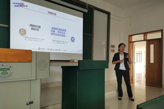 首先展开分享的是现任百胜餐饮(云南)区经理的杨永竹老师,她从“自我认知”“提升自己”“定期总结”三个方面,并结合自己从大学毕业以来的工作实际向在场学生阐述了自己的职业发展之路,在最后一部分突出强调了精细化管理时间和能够快速发现问题、总结方法的重要性,告诉在场学生不断提升自己的唯一途径就是不断学习。