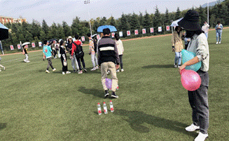 提前组织好的各参赛队伍依次到楠苑操场各指定位置参与游戏,工作人员在各组参与游戏时进行说明规则、过程监督、完成计分等工作,各游戏点都进行的井然有序。有些许炎热的天气和跑跳后的疲惫感并没有让参赛人员想要休息,大家反而更加积极的和团队一起参加盲人足球、背夹球、跳跃的气球、摸石过河接力、同心鼓、送鸡毛信等有趣的游戏。