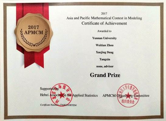2018年4月27日,威廉williamhill官网周维甜(2017级应用统计专业硕士研究生)、邓雪菁(2017级运筹学与控制论硕士研究生)、唐鑫(2014级统计学本科生)三名同学在第七届亚太地区大学生数学建模竞赛(APMCM)中荣获特等奖。