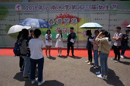 4月25号中午12点半,2018年云南大学第十三届女生节活动之“闺蜜大作战”在楠苑知味堂门口举行。此次活动分为上午和下午两轮活动,吸引了各学院的学生积极参与其中。