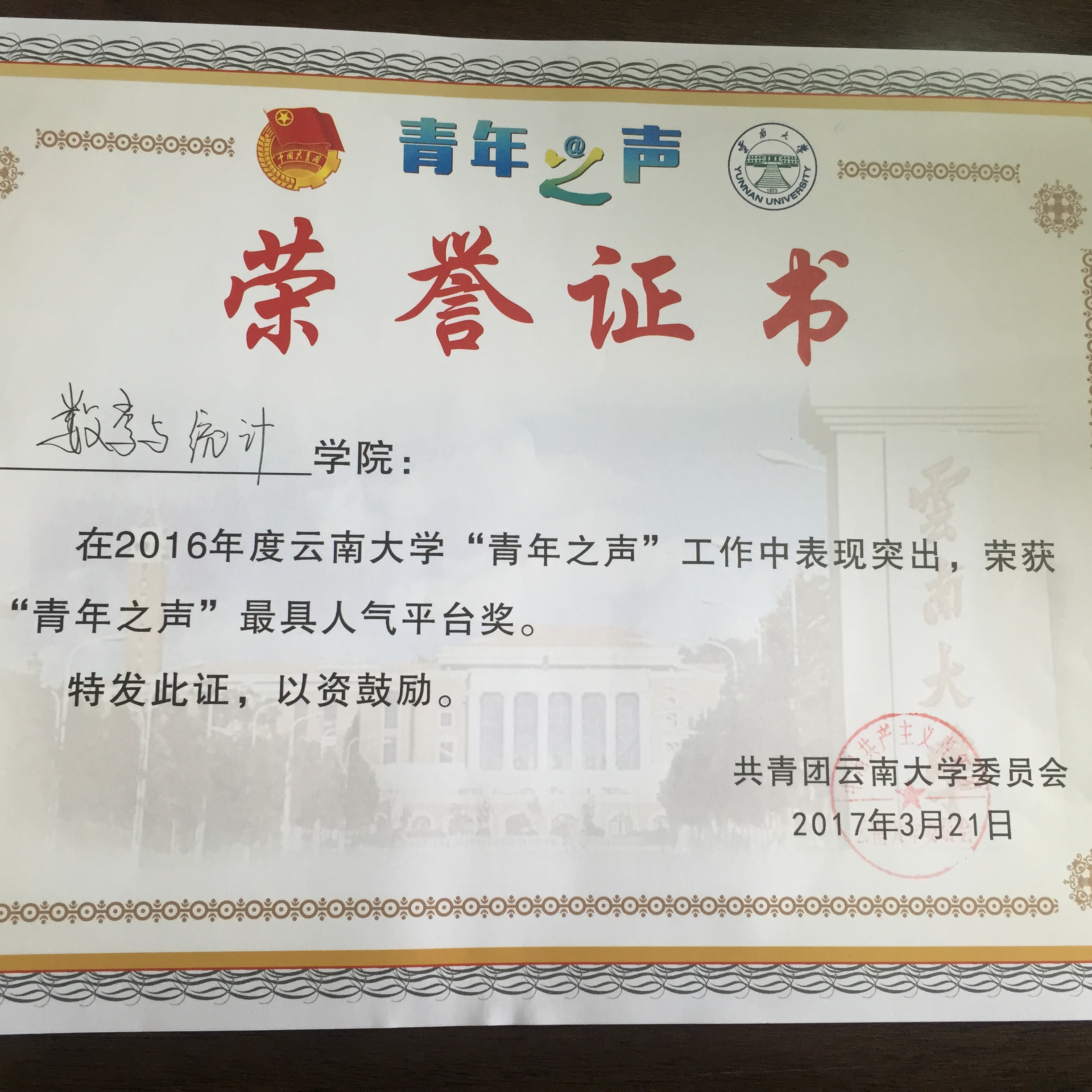 在学校3月21日召开的青年之声工作表彰大会上,我院2016年青年之声工作表现突出,被评为“青年之声”最具人气平台奖、平台活跃团队三等奖、先进书记奖和优秀管理员奖。