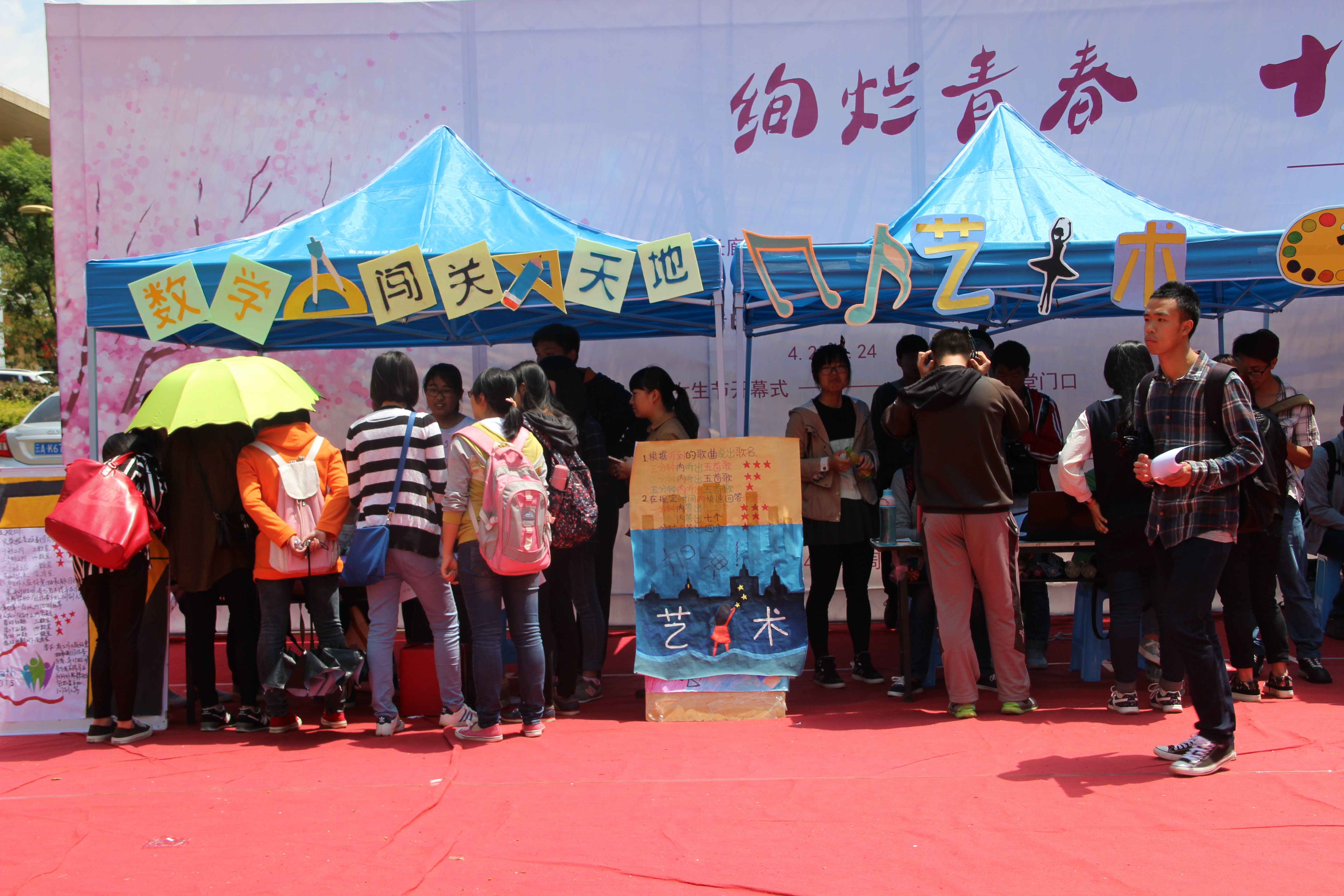 4月24日中午,我院在楠苑食堂门口举行了2015年云南大学第十届女生节系列活动——“数学大问答”,此次活动参与的人数非常多,现场十分的热闹。