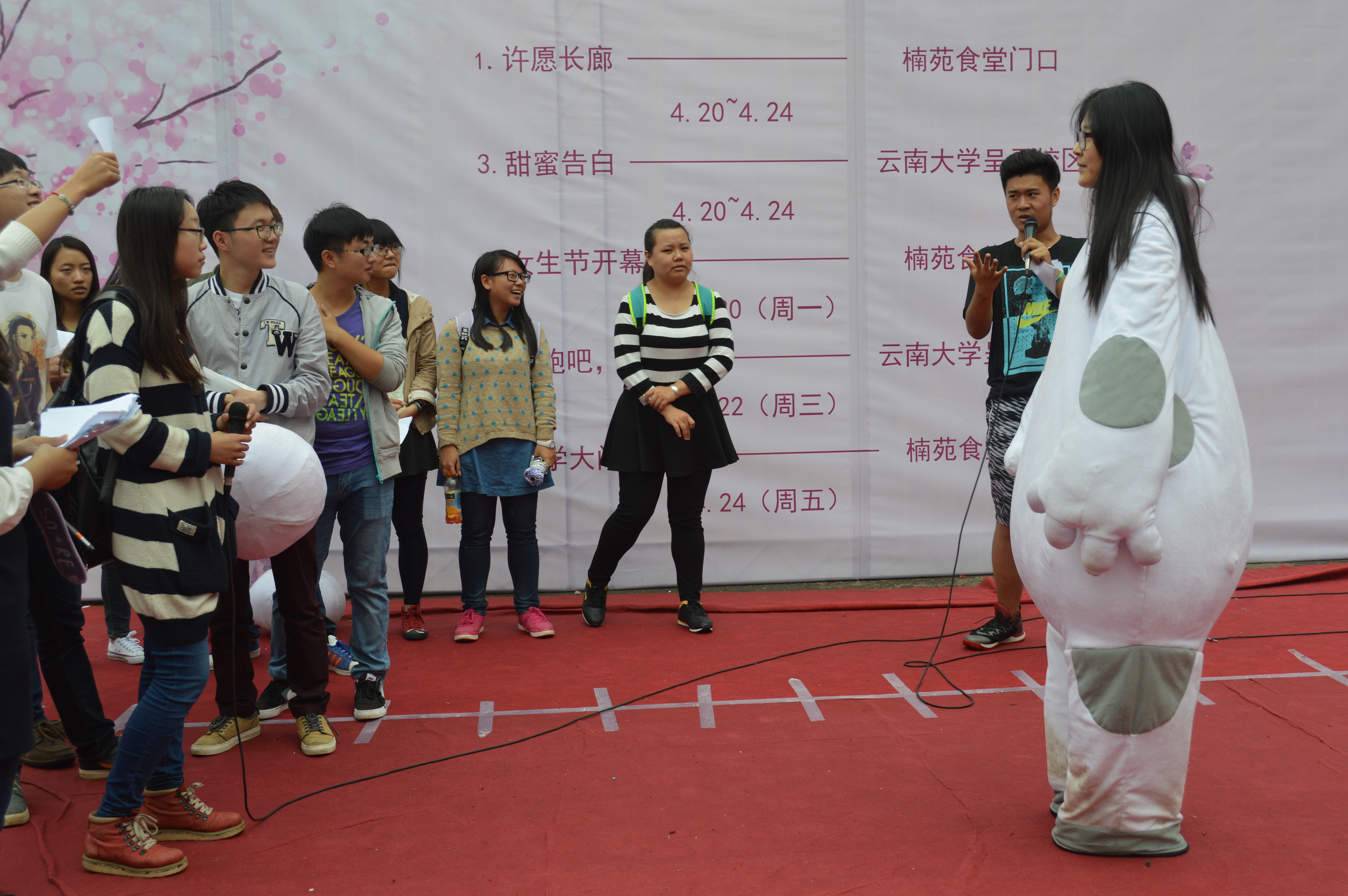 4月23日中午12点,在呈贡校区楠苑食堂门口,2015年云南大学第十届女生节系列活动——“闺蜜大作战”正式开始,本次活动以每组互为闺蜜的两人竞赛的形式进行,目的在于提高女生节的关注度与参与度,拉近女生之间的关系,使彼此的情感真实的表现出来。