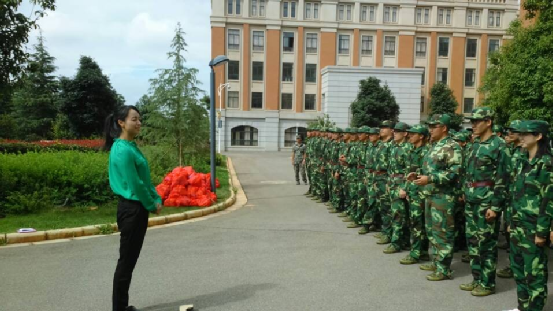 在同学们殷切崇敬的目光中,学院的老师们们向我们走来,他们的到来在辛苦的军训生活中为同学们带来了新的动力,使同学们深切体会到了领导老师们对学生的关爱。所以我们的口号比平时更响亮,我们的身姿比平时更挺拔,我们渴望老师看出我们的朝气、决心与昂扬的斗志。辅导员李丹老师向我们一一介绍了本次慰问的相关领导与老师,同学们表示了热烈的欢迎。学院党委副书记杜芳芳老师对我们进行了鼓励,她教育我们,军训是进入大学的第一课堂,尽管过程辛苦,但她仍坚信我们会把这堂课上好,交出一份令教官、老师、自己都满意的答卷,同时,杜老师也对教官的辛勤付出表达了尊敬与感激之情。
