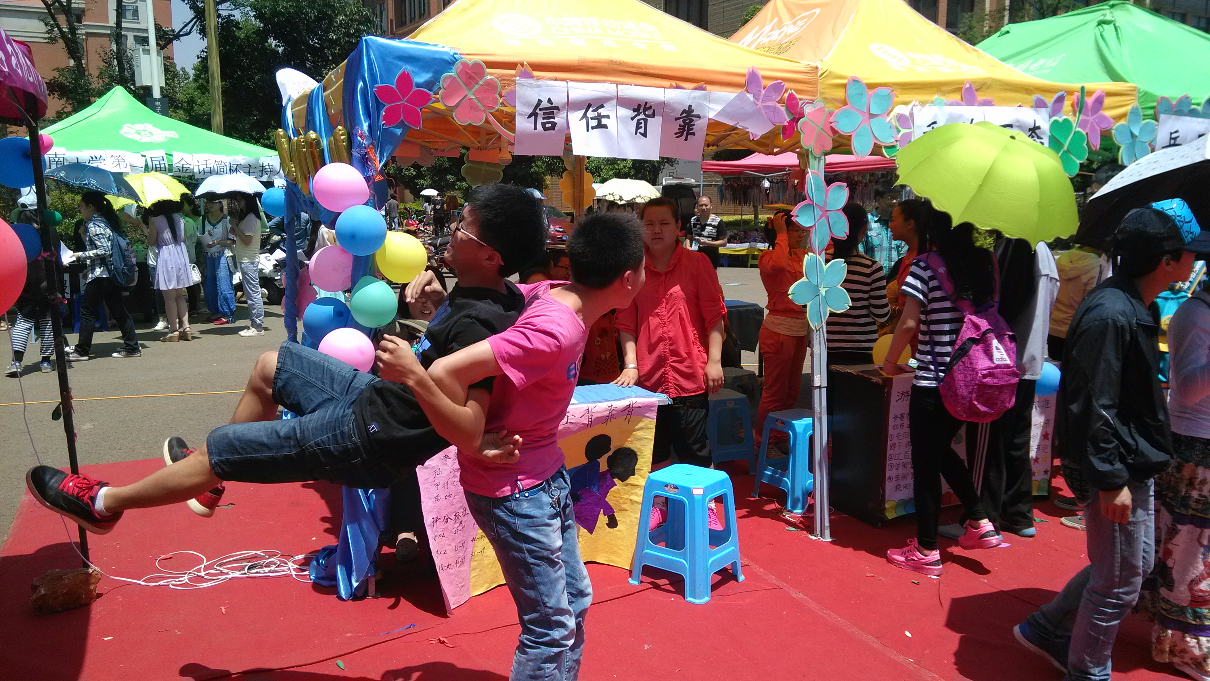 上午九点,我院同学们就开始聚集摆点,为中午游园会的正式开始做准备活动。中午十一点多,各专业在楠苑食堂外面的摊点---信任背靠背,千姿百态,乒乓夹夹乐,多多衣善,穿针引线和疯狂叠叠乐六个活动率先开始,不少下课的同学都参与了游戏,并赢得了属于自己的奖品。