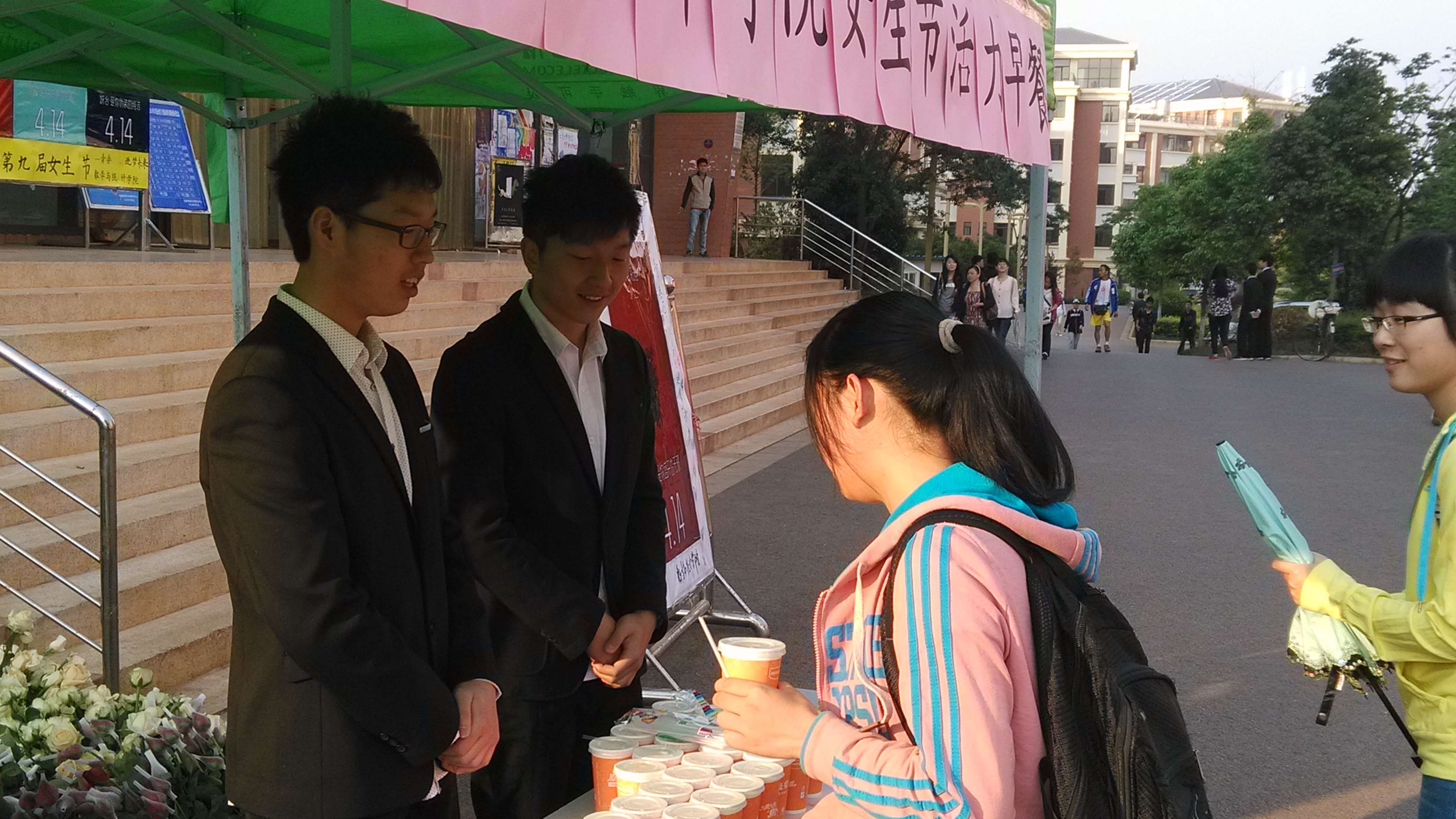 早上6点半,我院学生会和团委的男生们就齐聚在楠苑五栋宿舍楼下,准备为女生们服务。男生们穿着整齐精致的西装,买好早餐,准备好给今天的“幸运女神”们一个意外的惊喜。今天的“活力早餐”活动的幸运色是红色,所有身穿红色衣服的女孩们都能免费获得由数统学院为她们提供的活力早餐,并收到男生们热情的节日问候。在这寒意还未消散的早晨,面对“男人帮”送去的一份份早餐, “幸运女神”们的脸上充满了幸福的笑容。在这个微凉的清晨,男生和女生们为我们的校园增添了一份和谐。这次的活力早餐活动将从14日开始持续五天,到18号结束,每天都会选出一个幸运色为穿着这个颜色衣服的女生送上活力早餐,相信每个女生都能成为幸运女神,享受这样一份温暖。