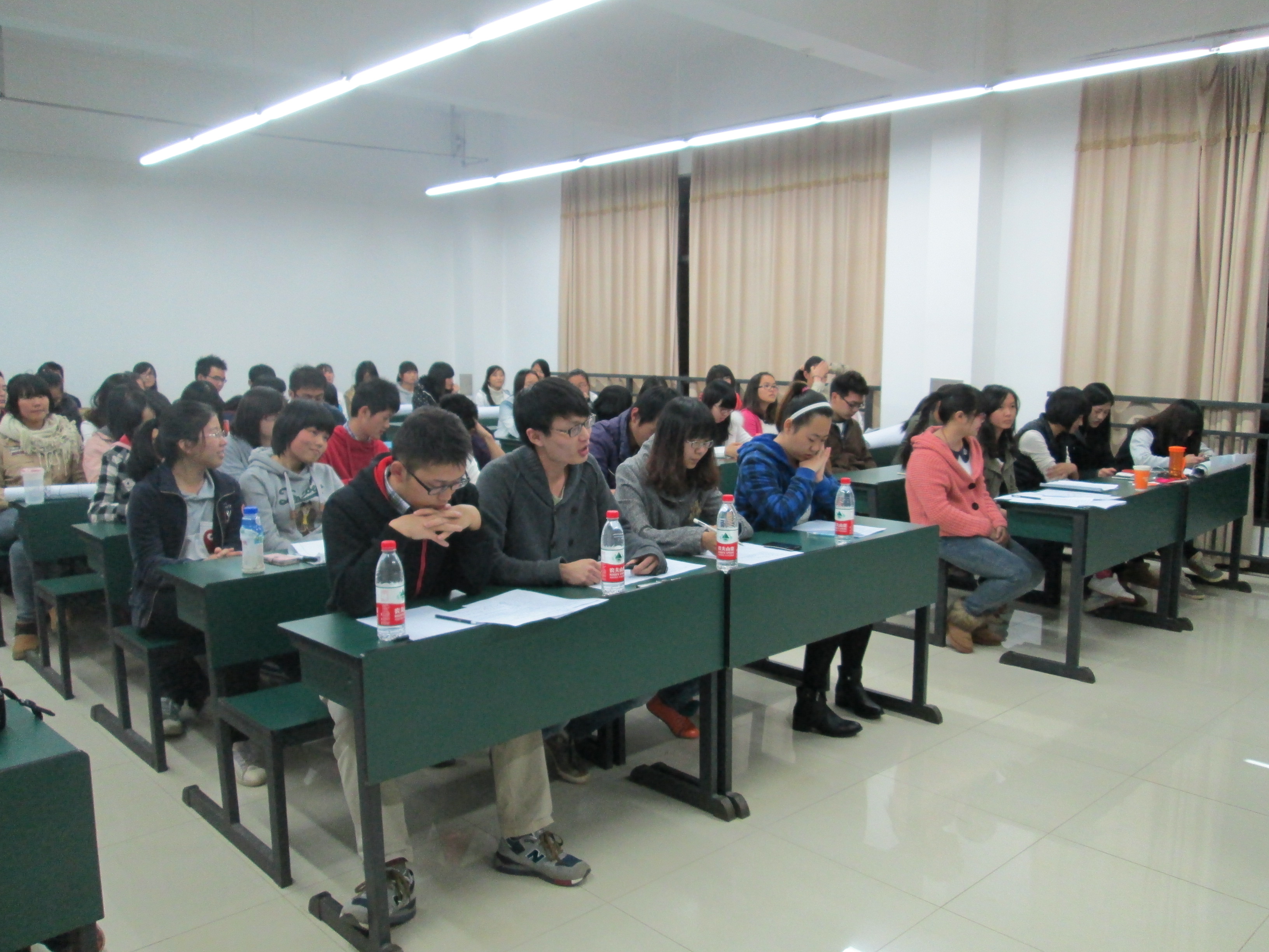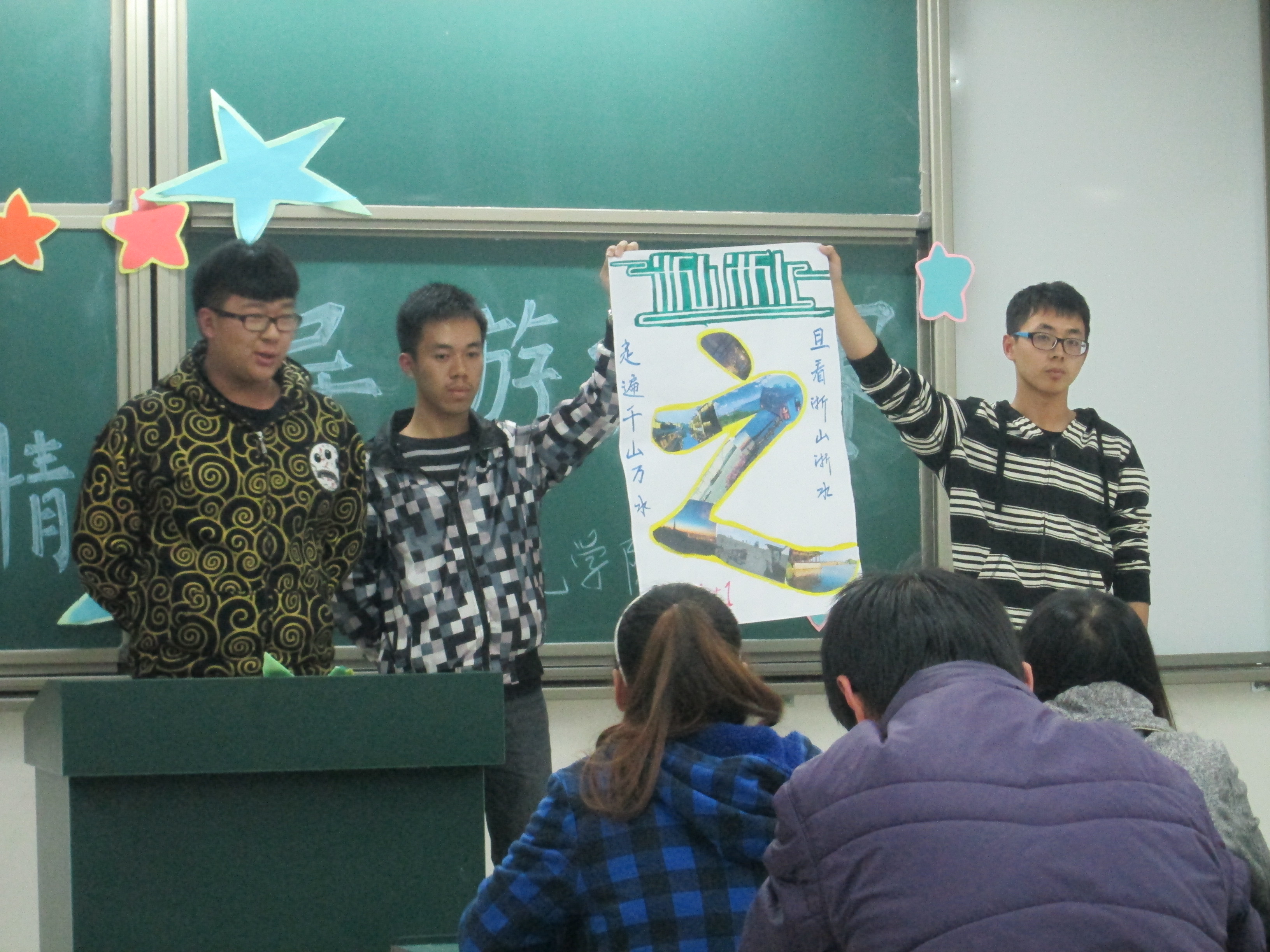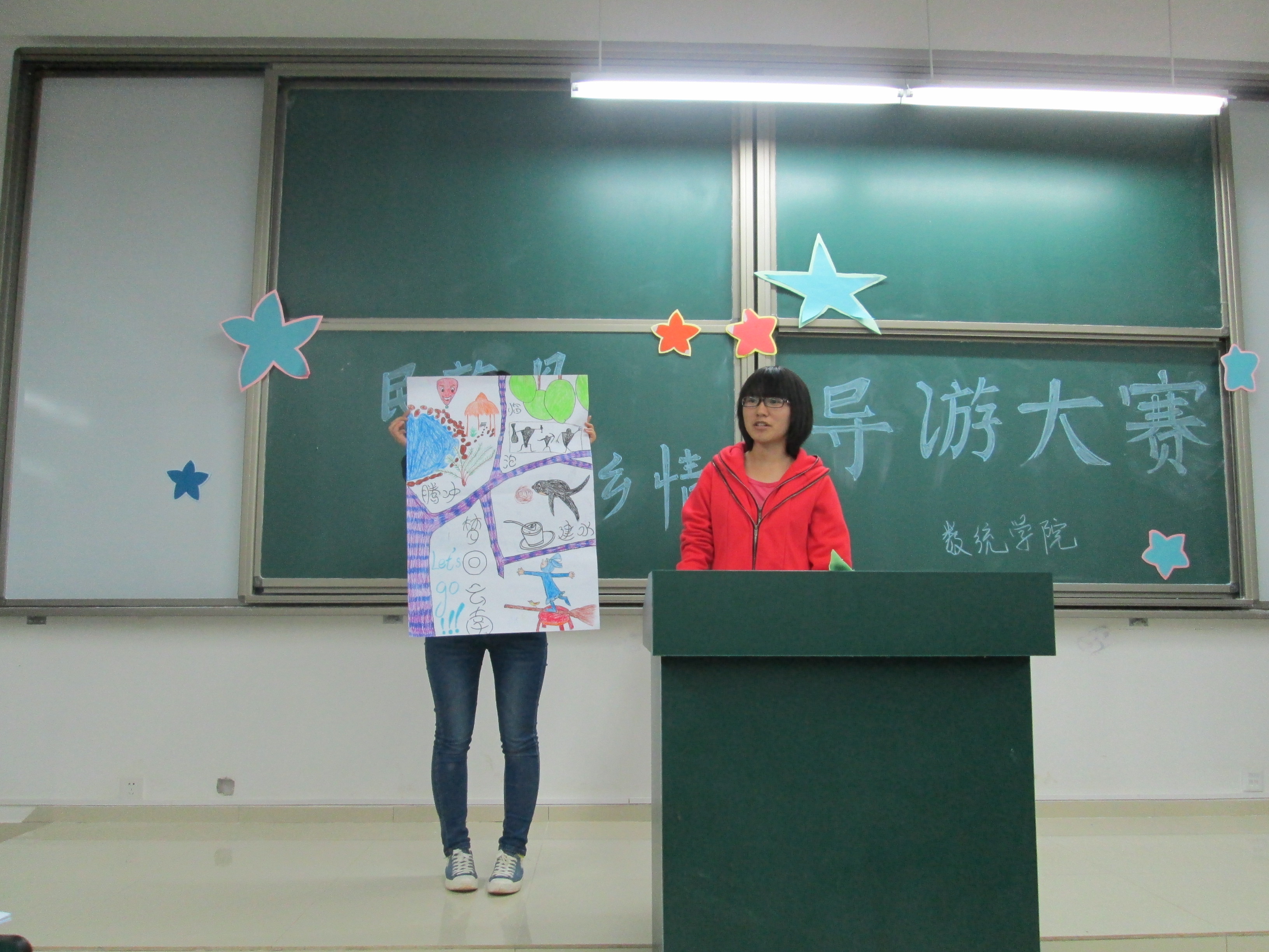我院”民族风 家乡情”导游大赛初赛于2013年11月23日晚七点格物楼2104正式开始,由数统学院12级学生施超担任主持人,还有学生会副会长及团委副书记做评委。