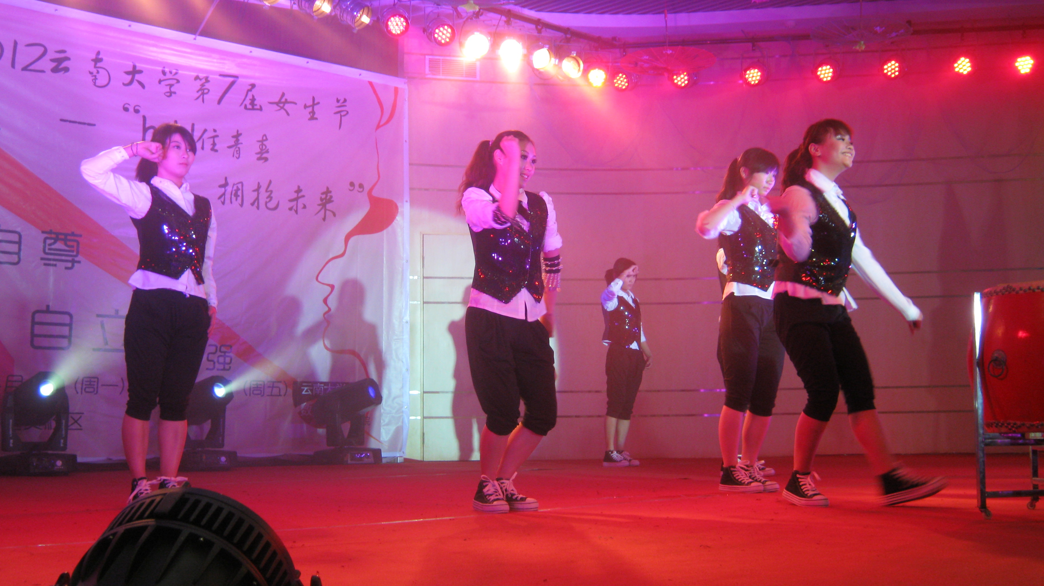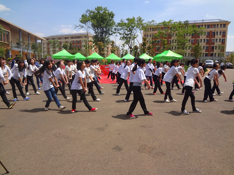 11日,云南大学第七届女生节进行到第三天,进入到女生节的高潮,中午12点整,威廉williamhill官网的20名女生在《马德里不可思议》的音乐中向同学们展示了一段活力舞蹈,受到了大家的欢迎,很多同学参与其中,形成了一支庞大而充满活力的队伍,显示出女生们的青春与活力。