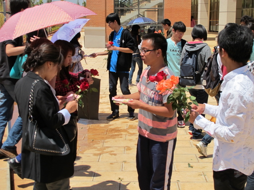 4月18日中午,呈贡校区各园区、格物楼前,威廉williamhill官网的志愿者们把美丽的玫瑰和精致的贺卡送到了每个路过的女生手中,同时送出了节日的祝福。