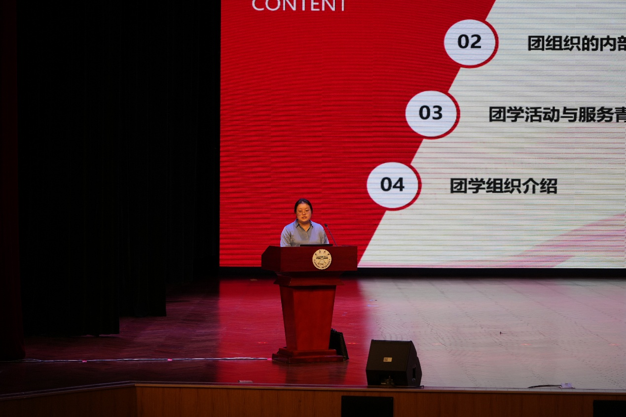 学院团委书记王蔓琦老师,对学院共青团工作进行简要介绍,详细说明了“第二课堂”制度,向新生展示了学院特色的第二课堂学生活动,并勉励学生积极参与实践竞赛与校园文化活动,全面提升综合素质。