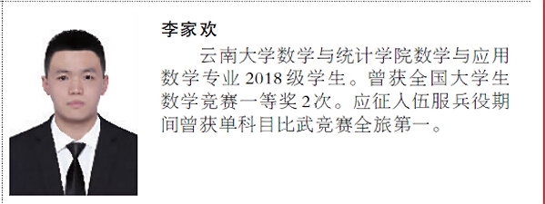 李家欢同学在服役期间曾获单科目比武竞赛全旅第一,在校期间荣获国家奖学金、第十一届全国大学生数学竞赛决赛一等奖(全国第七)、第十二届全国大学生数学竞赛决赛一等奖(全国第十二)、云南大学一等奖学金、云南大学熊庆来奖学金、云南大学大学生年度人物等。两年的军旅洗礼,让李家欢同学愈加沉稳、坚毅,时刻胸怀祖国和人民。退役复学后,他立即投入到紧张的学习中,不仅克服了两年的学业断档期,更是通过不懈努力,实现了云南省在全国大学生数学竞赛一等奖“零”的突破。李家欢同学三年学业成绩名列前茅,现已推免至中国科学技术大学攻读直博研究生。