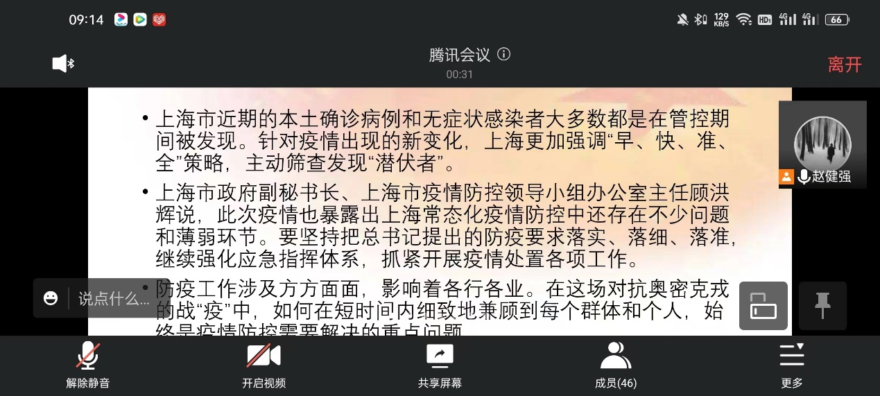 本次疫情防控线上主题团日活动的开展,使与会学生深入了解到疫情阻狙战的相关情况,提高了学生疫情防控意识,增强了同学们的责任感。作为健康的第一责任人,学生们应该主动学习防疫疫情防控知识,落实疫情防控的措施。一代人有一代人的使命,相信大家都能坚定信念,戮力同心,打赢这场没有硝烟的战争。