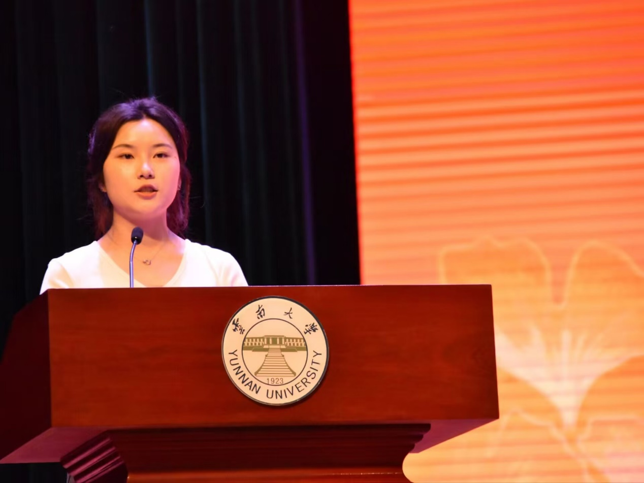 2021级本科生罗丽兰作老生代表发言。她讲述了自己的大学经历,分享了如何在学业与生活中找到平衡,如何在各种活动中发掘自己的潜力;呼吁同学们要自我学习,独立思考,找准自己的节奏,合理支配自由时间,塑造自我,追求梦想,让大学生活变得更加充实和精彩。