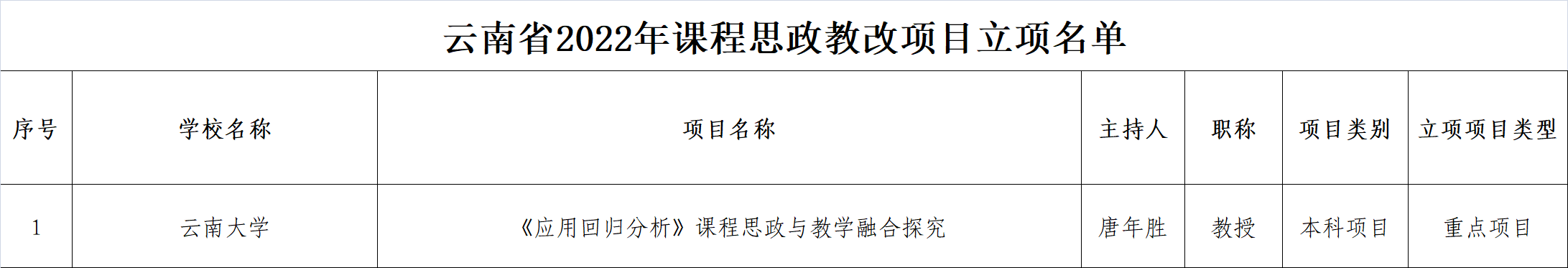 根据《云南省教育厅关于组织开展2022年课程思政教改项目申报工作的通知》要求,经各本科学校初审、省教育厅组织专家网络评审,立项6个重点项目,91个一般项目。我院“《应用回归分析》课程思政与教学融合探究”获云南省2022年课程思政教改重点项目
