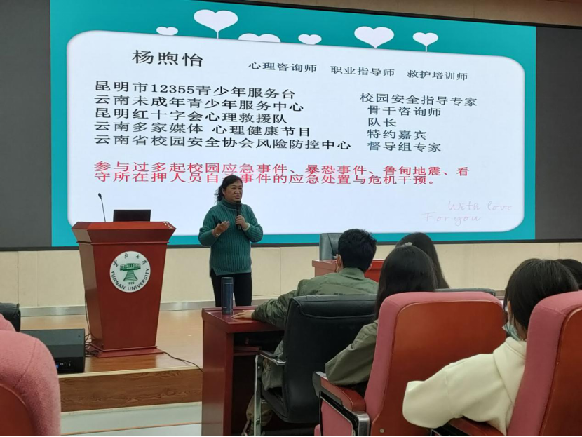 本次讲座的主讲人杨熙怡老师分别从“解读压力与情绪”,“情绪的自我调节” “减压妙招”三方面入手,丰富学生对心理健康的认知并提高了学生对心理健康管理的能力,使学生们受益匪浅。