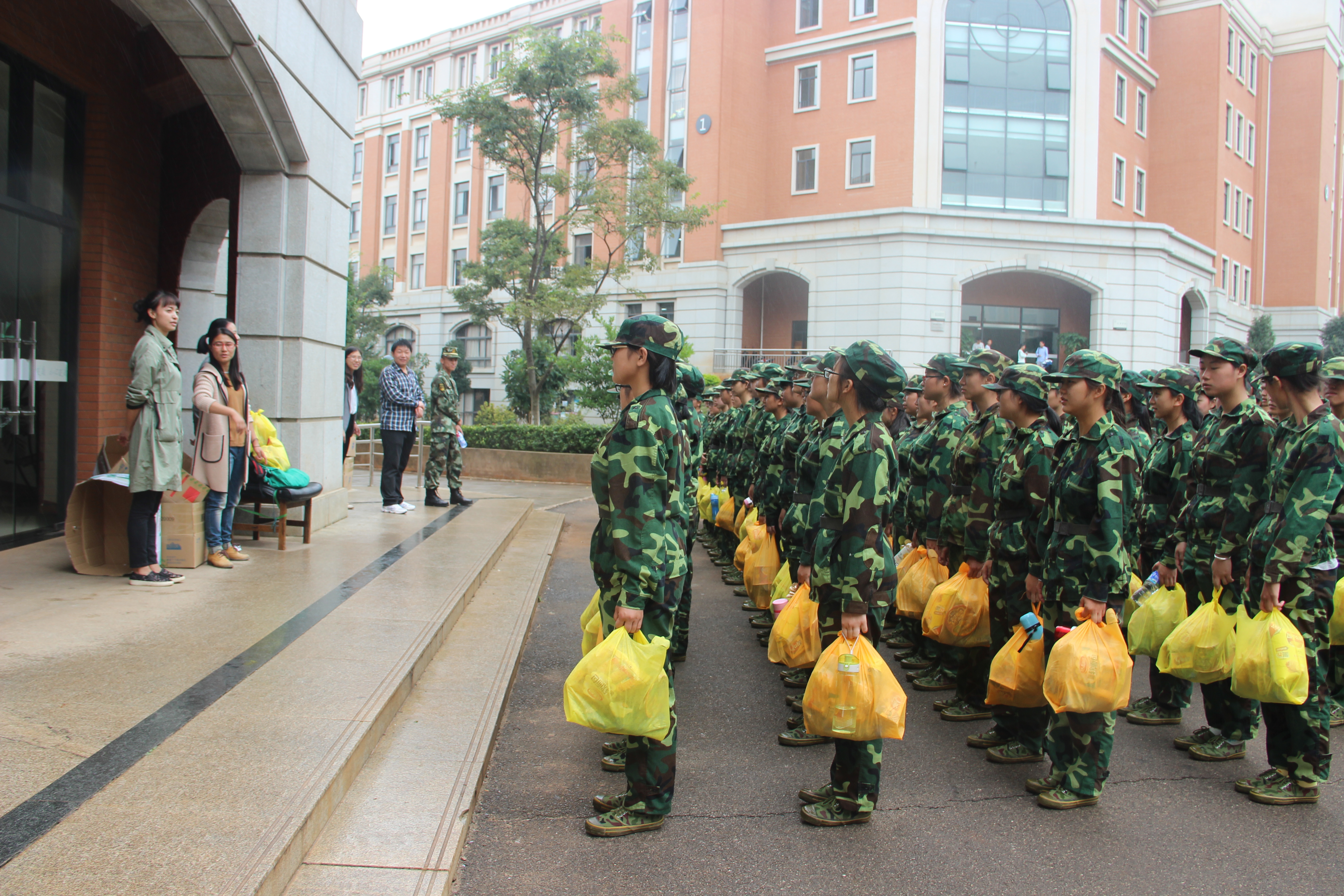 12点左右,男生连,女生连在领取慰问品之后,教官再次下令整理队伍,宣布下午的军训时间及军训任务后解散了队伍。