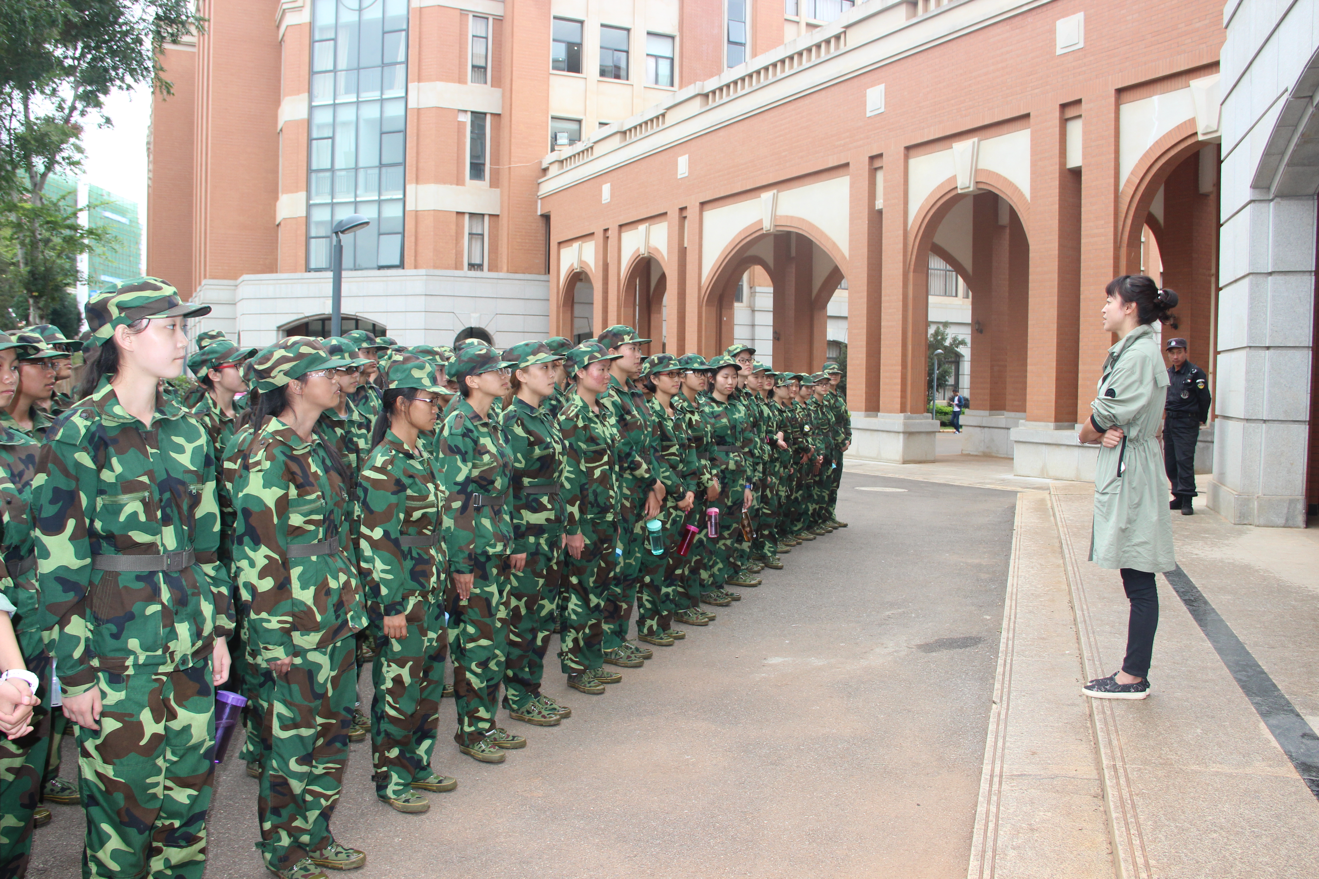 在男生连领取完慰问品后,女生连也按时来到慰问地点。整理好队伍后,女生连也接受了杜芳芳的问候及鼓励。女生连严肃地听完副书记杜芳芳的讲话后,在老师的指令下依次井然有序地领取慰问品。“谢谢老师……谢谢老师……”女生连礼貌地顺序从老师手中领取了慰问品。