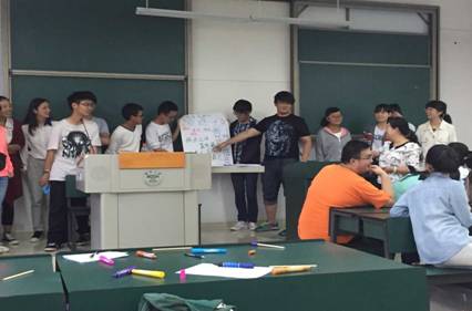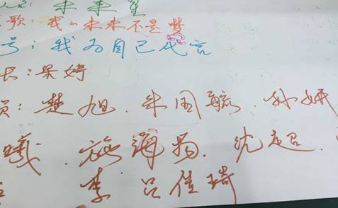 接下来,老师发给每一组一张海报纸,用五分钟时间来决定每一组的队名,队歌,队伍的口号。任务下达后,同学们便开始了激烈的讨论,大家都尽心竭力来用简短的队名来尽可能地表达自己的队伍的中心思想,来吸引住别人的注意。五分钟过后,老师要每一组上前展示自己的成果,大家的队名都十分吸睛,有叫未来星的,也有叫机智的蓝精灵的,各具特色,个性十足。队歌有励志的我的未来不是梦,有俏皮的蓝精灵之歌。之