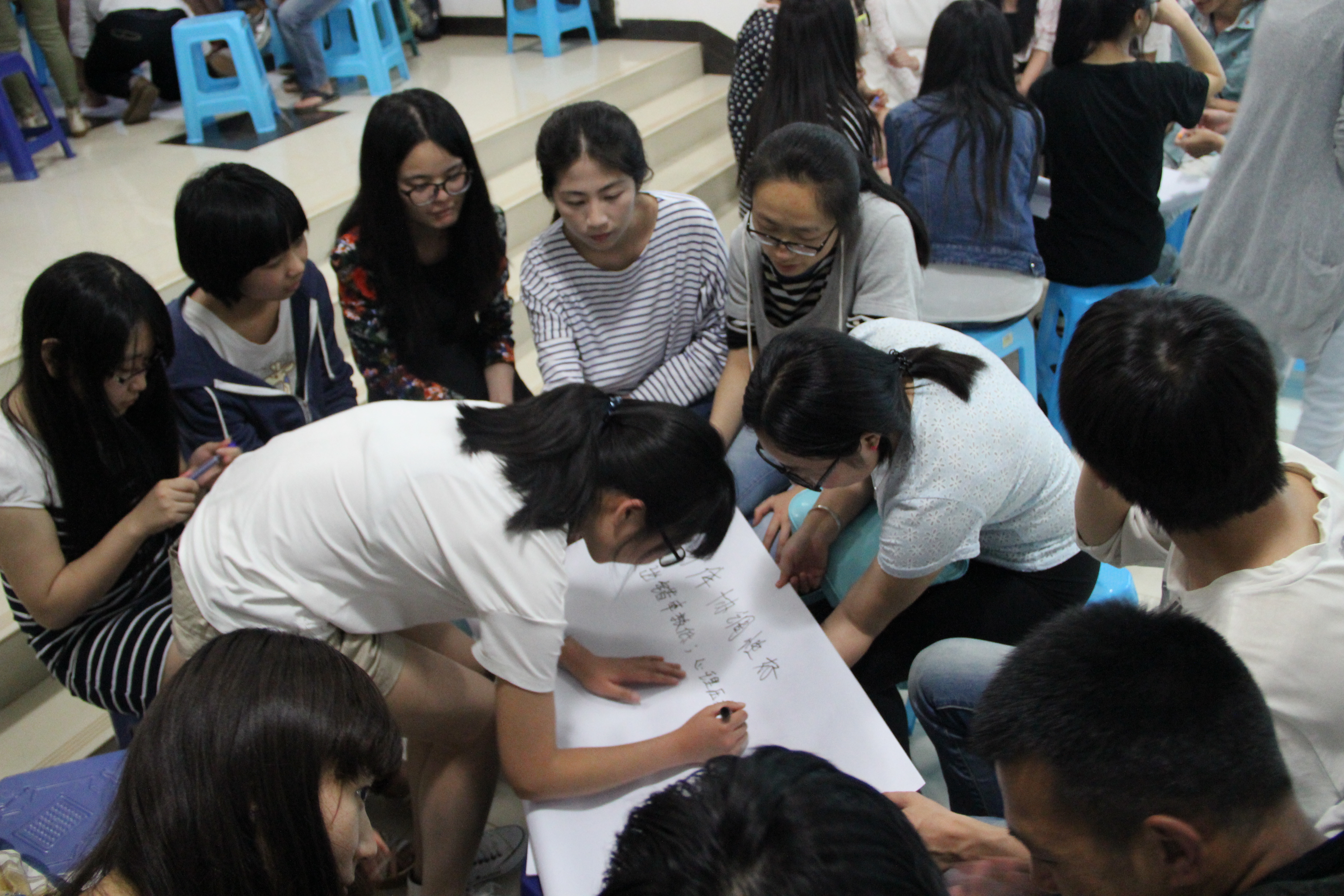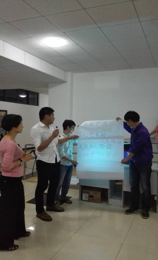 5月8日晚,我院邀请了职业规划师王妍老师和她的团队,带领同学们一起走进职业规划的世界。活动首先由一个小游戏——口香糖游戏开场,随着游戏的进行,同学们之间生疏的氛围也消散不见了。紧接着,王老师将同学们分成六组,同学们在各自的推荐下选出自己的组长并在组长的带领下用新颖的肢体介绍法介绍了自己小组,从中展示自己的才能。
