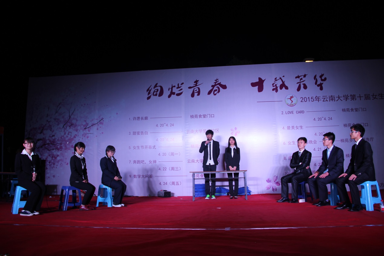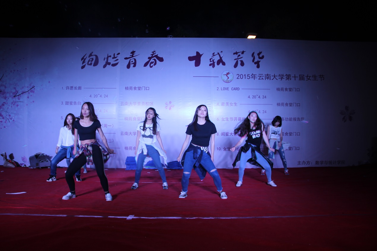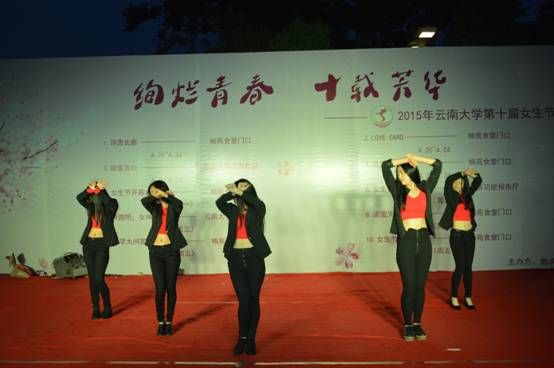 2015年云南大学第十届女生节闭幕晚会于4月24日晚7点,在楠苑食堂门口拉开帷幕,时长五天的女生节就此接近尾声。
