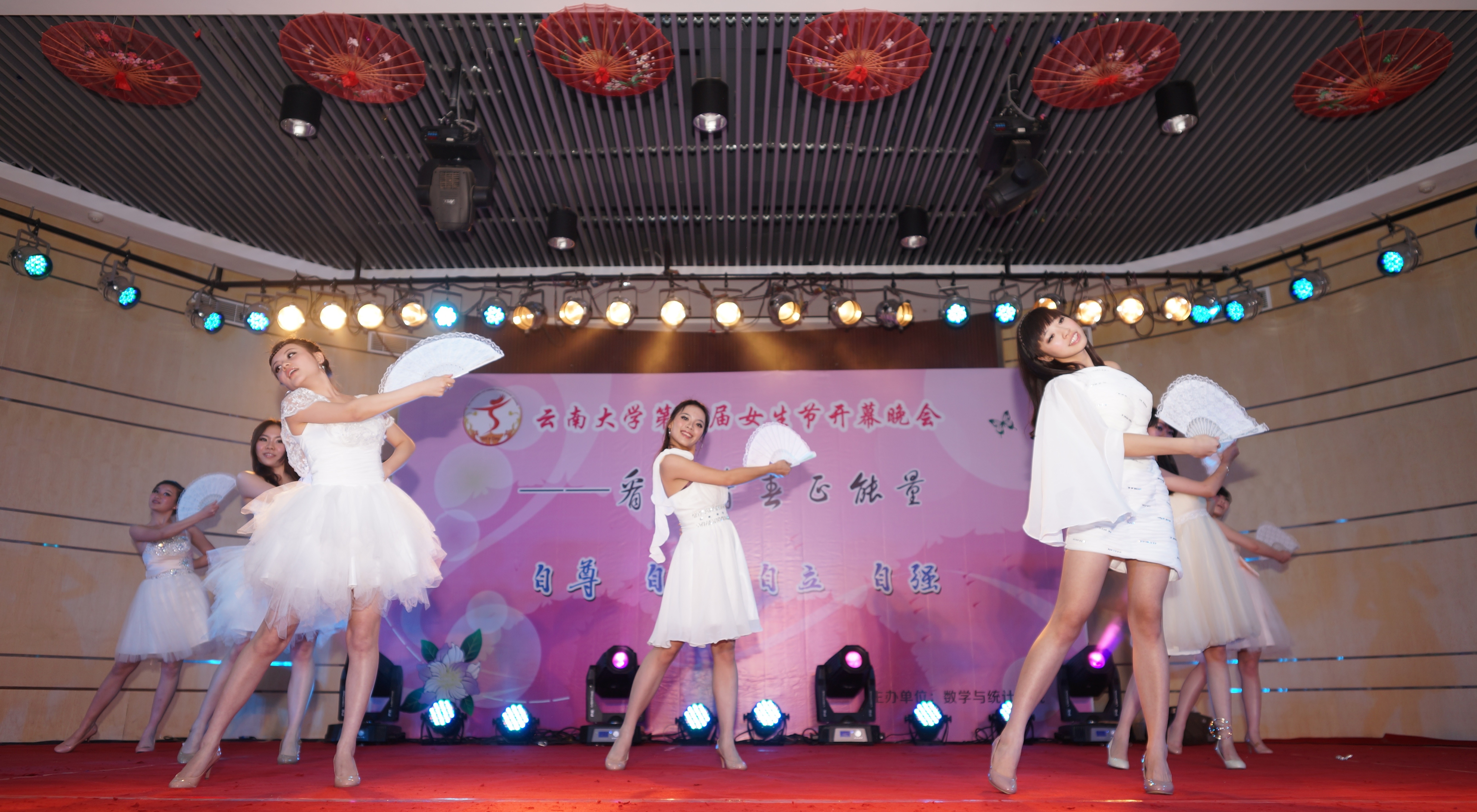 9点, 我院在呈贡校区楠苑综合楼二楼多功能报告厅举办了2013云南大学第八届女生节开幕晚会,本次晚会以“看我青春正能量——自尊 自信 自立 自强”为主题,展现云南大学女生的风采。