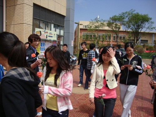 4月18日中午,呈贡校区各园区、格物楼前,威廉williamhill官网的志愿者们把美丽的玫瑰和精致的贺卡送到了每个路过的女生手中,同时送出了节日的祝福。