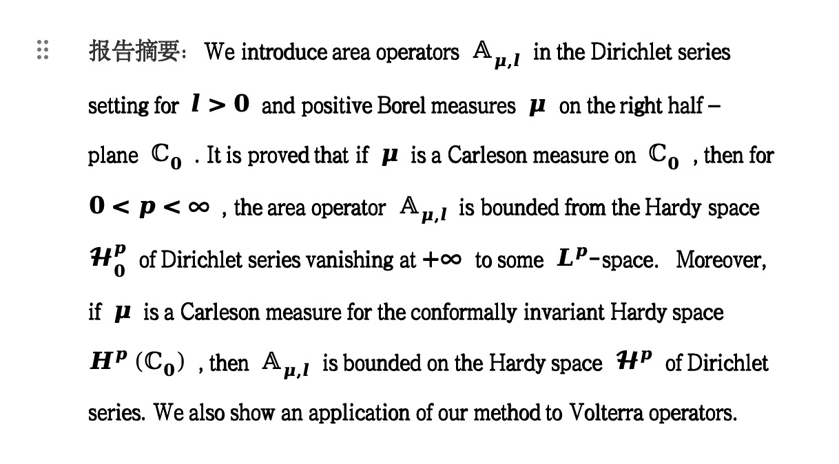 报告人简介:王茂发,武汉大学威廉williamhill官网教授,博士生导师,武汉大学威廉williamhill官网副院长,全国泛函分析空间理论学术委员会成员、现代分析数学及其应用学术委员会成员,主要研究领域为泛函分析及其应用、函数空间上的算子理论,先后承担国家自然科学重点项目、面上项目等多项,在 J. Funct. Anal., J. Operator Theory, Math. Z., Indiana Univ. Math. J., Sci. China Math. 等期刊上发表学术论文一百余篇。